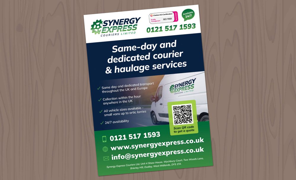 Design and print of A5 flyers for a courier & haulage company in Brierley Hill, Dudley. We designed these to match the branding and website design we did for them earlier this year. We added a QR code that takes you to the booking system on their website.